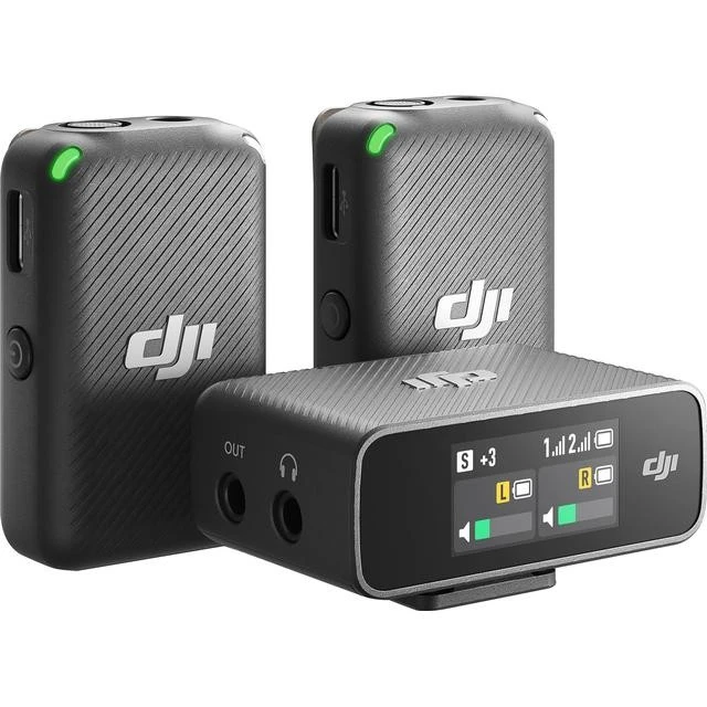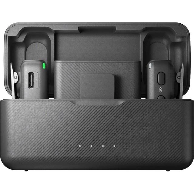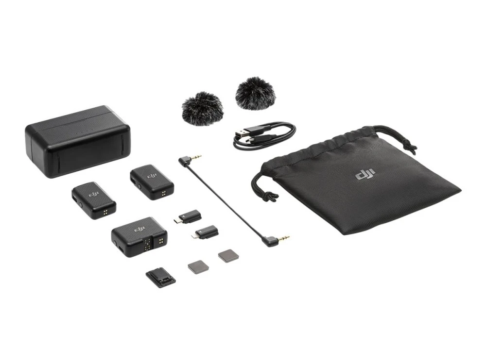 Meegeleverde uitrusting Draagtas, 2 microfoonopwindkappen, draadloze microfoonontvanger, oplaadetui, oplaadkabel, flitsschoenadapter, smartphone-adapter (verlichting), smartphone-adapter (USB-C), 3,5 mm audiokabel, 2 draadloze microfoonzenders, 2 microfoons klem magneet