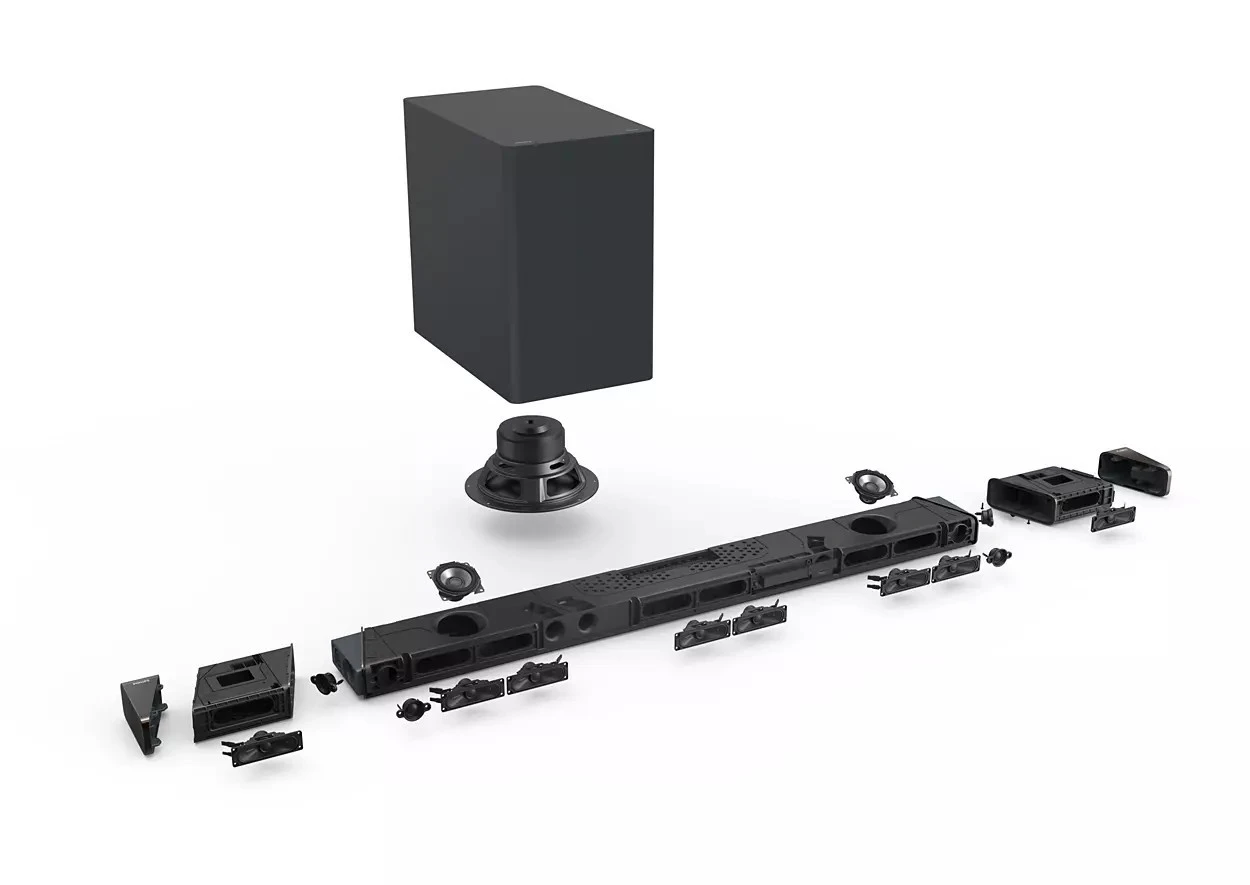 Deze soundbar zorgt voor een onvergetelijke meeslepende ervaring. 7.1.2 kanalen vullen elke kamer met rijke, diepe soundtracks, donderende effecten en sprankelende dialogen. De draadloze subwoofer voegt impact toe aan elke explosie en elke beat.