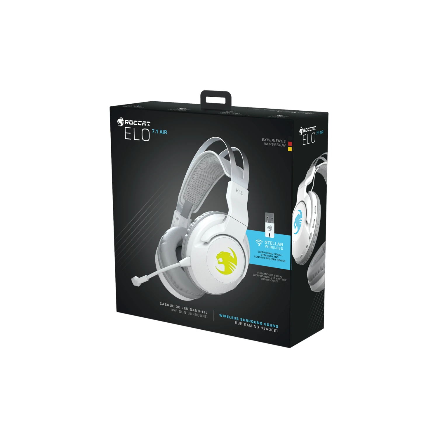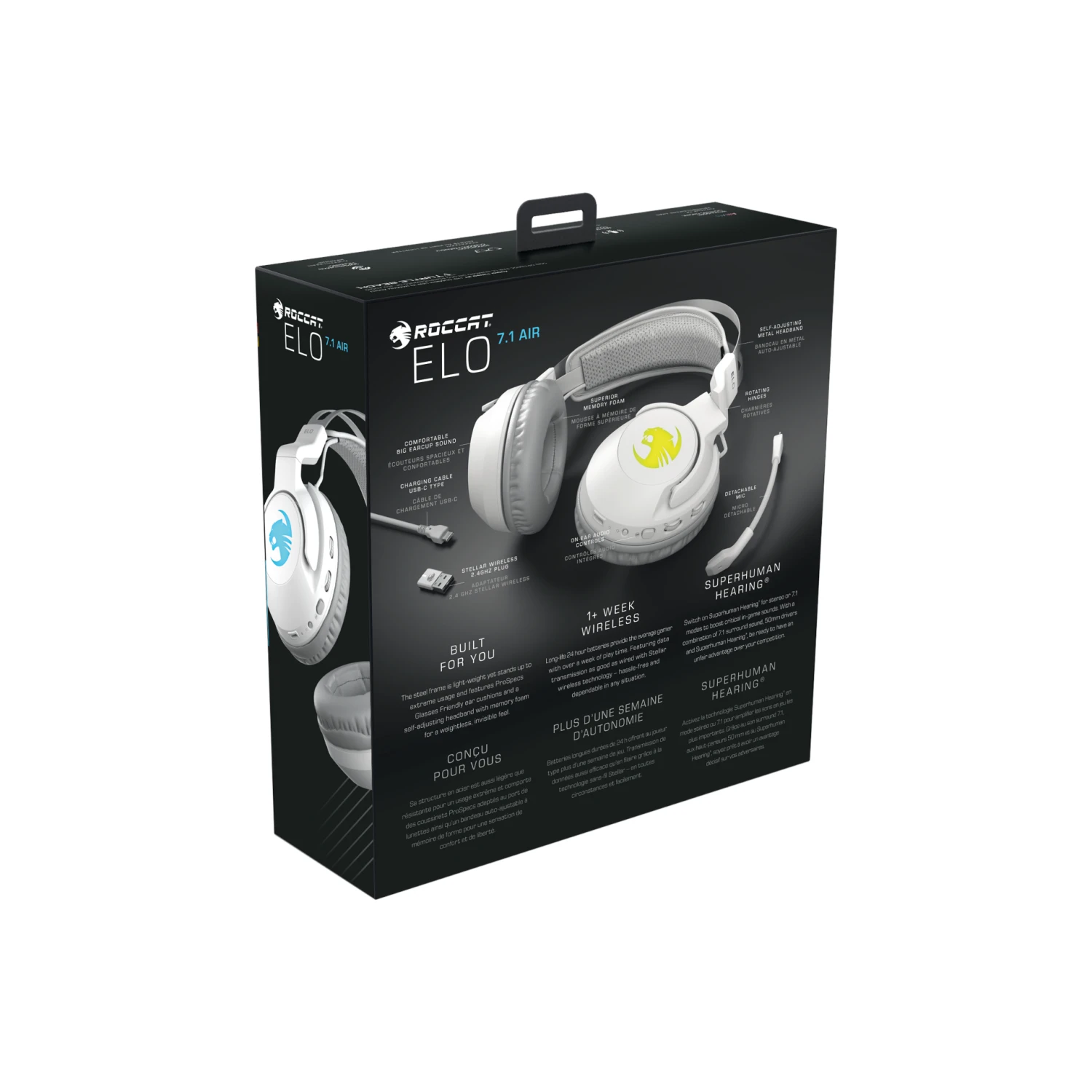De ROCCAT® Elo 7.1 Air Surround Sound RGB Gaming Headset combineert de nieuwste draadloze technologie met een gewichtloze pasvorm. De tijd voor compromissen is voorbij als je draadloos gaat met ROCCAT’s Stellar Wireless, dat net zo goed is als de kabel en een batterijduur van 24 uur waar gamers meer dan een week mee kunnen doen. Het 360°-surroundgeluid wordt aangedreven door nauwkeurig afgestelde 50 mm-drivers en is voorzien van Superhuman Hearing®-technologie om kritieke in-game audio een boost te geven.
