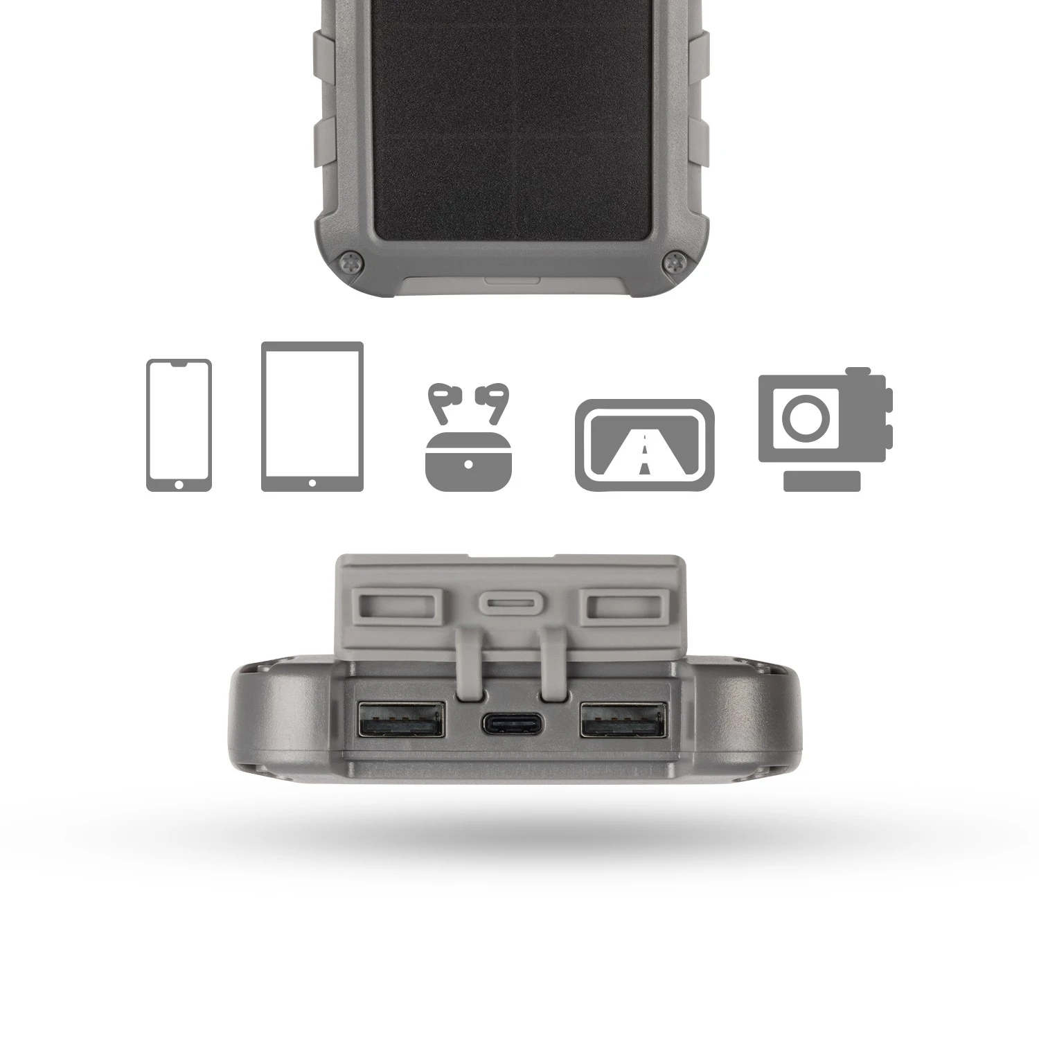 De zonnelader is uitgerust met een 10.000 mAh lithium-polymeer batterij, krachtig genoeg om een smartphone maar liefst 4x op te laden. De oplader heeft ook een 20 W USB-C-uitgang die je smartphone snel oplaadt, zodat je altijd klaar bent om te gaan.